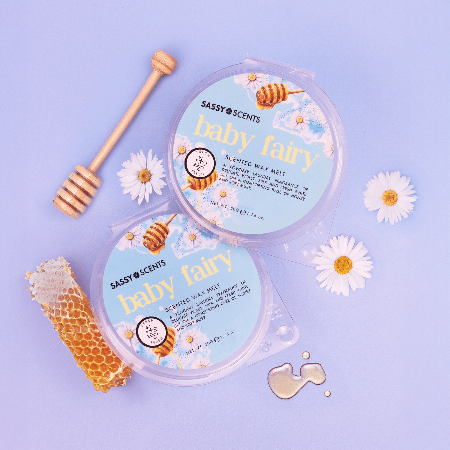 This Baby Fairy wax melt has been specially created using our own original soy wax blend and the best quality concentrated sassy scents. Some of our wax melts contain essential oils to create the perfect blend of fragrance.